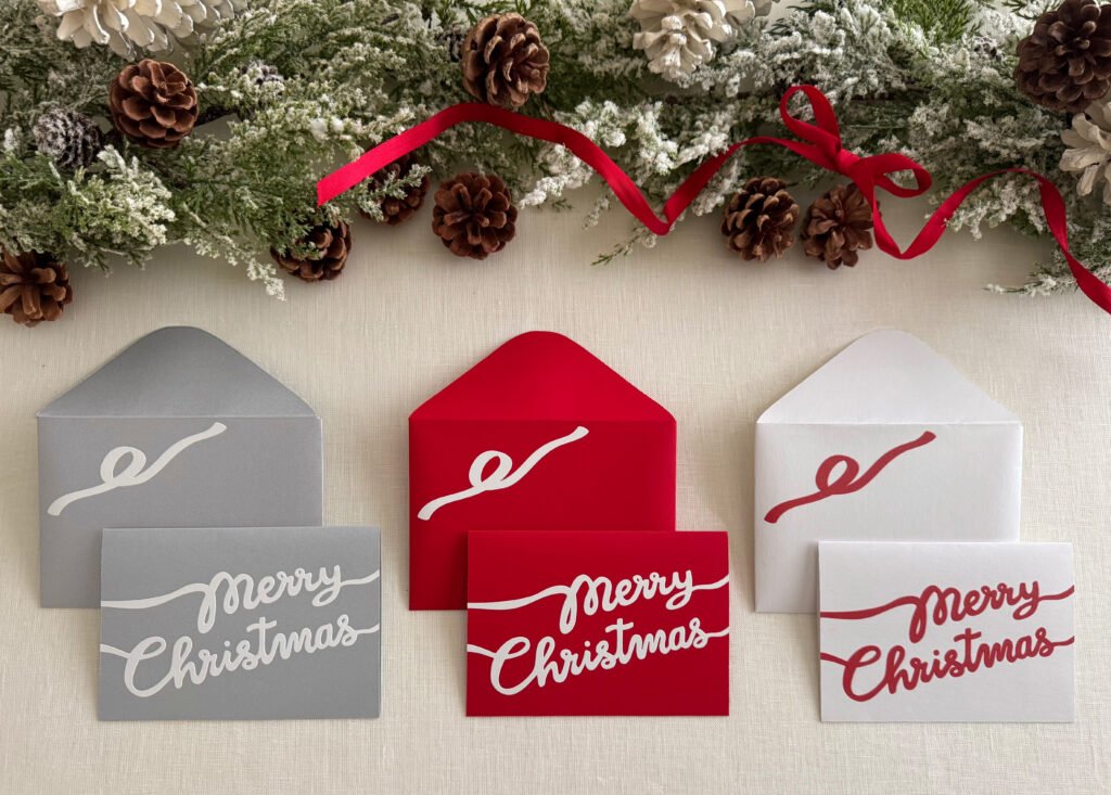 Cada tarjeta muestra un diseño inspirado en un listón navideño que suavemente escribe la frase Merry Christmas, haciendo juego con el sobre que a su vez muestra un detalle de listón que los conecta con armonía.