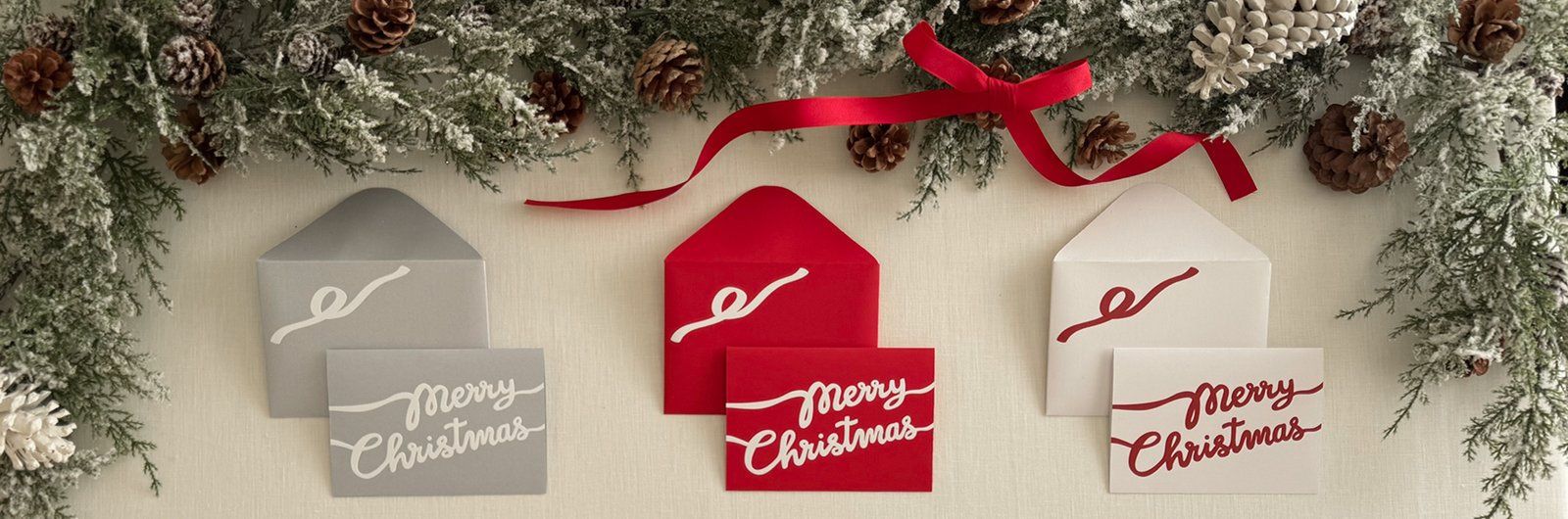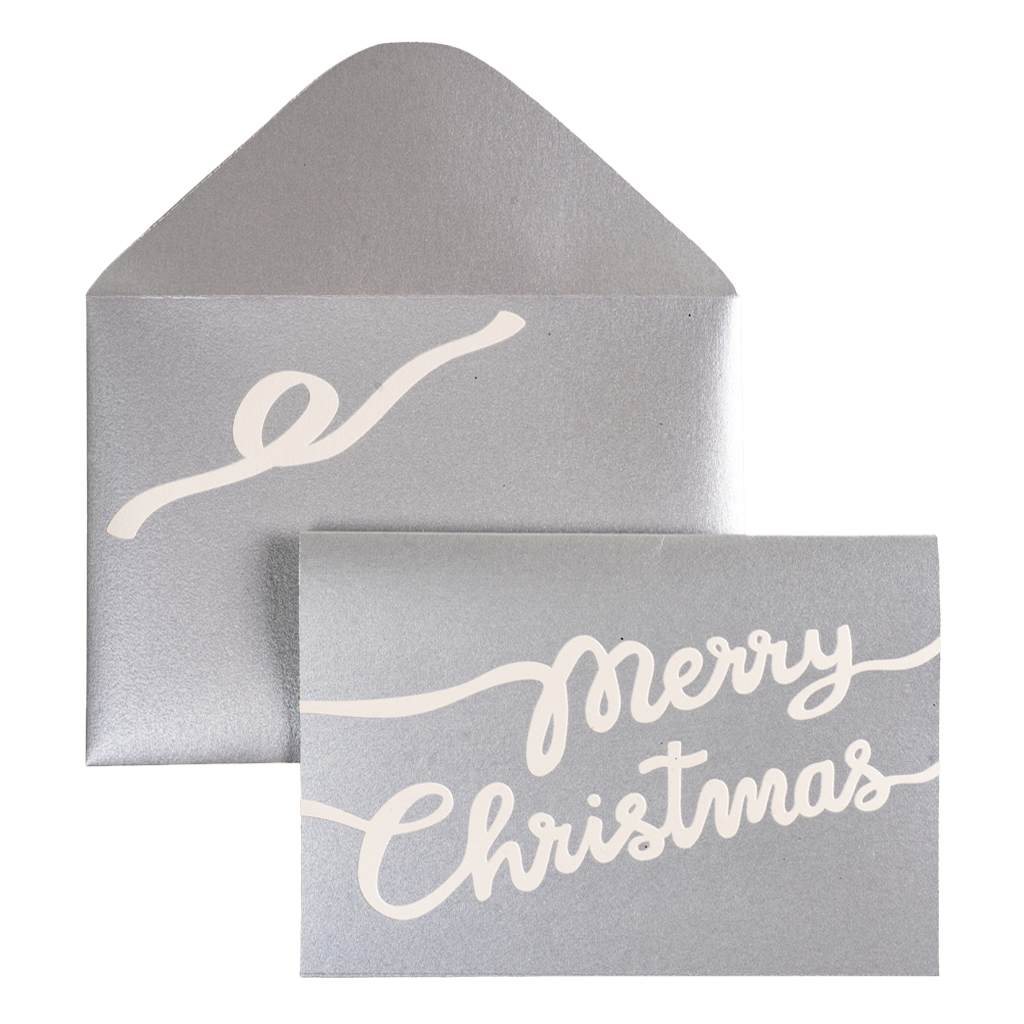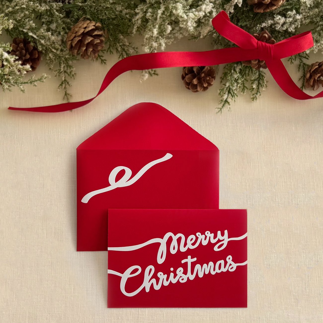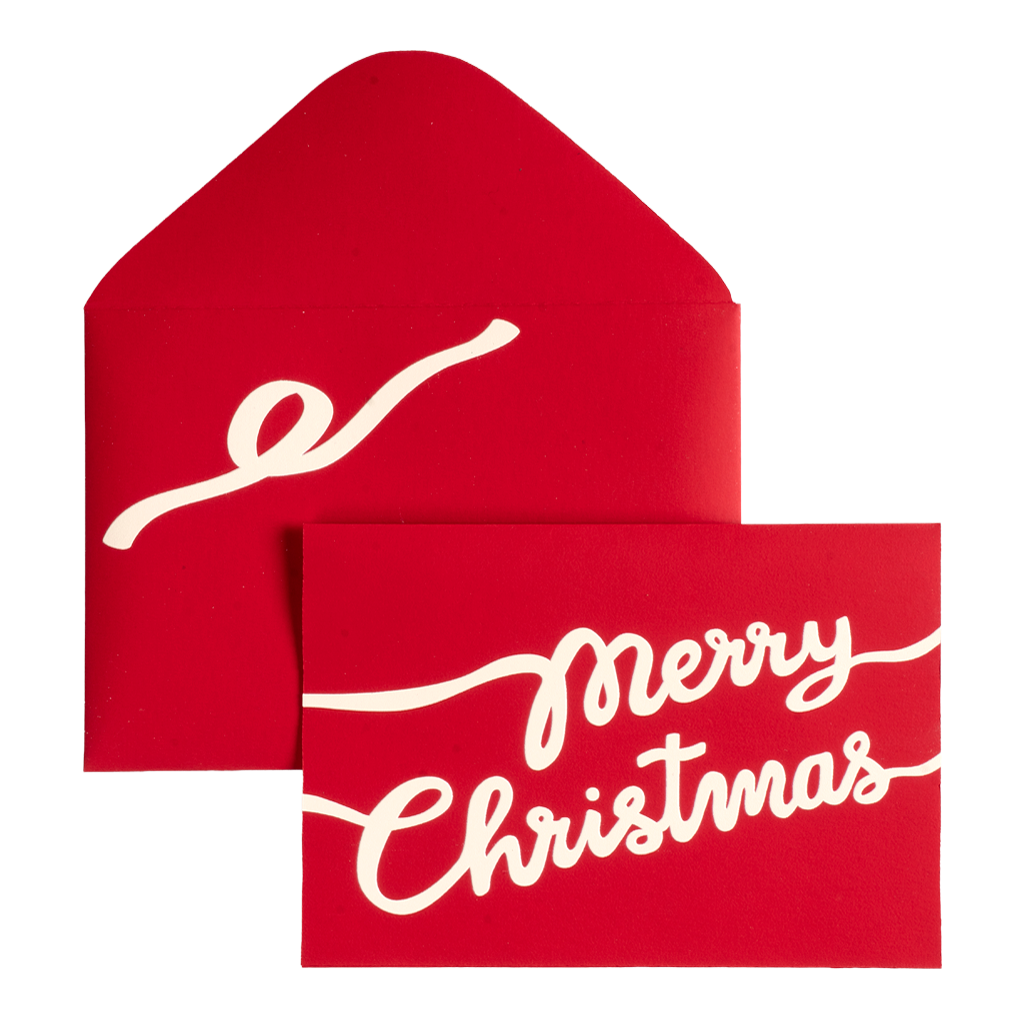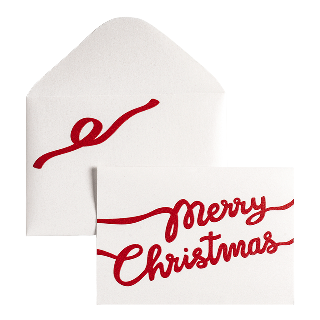 Cada tarjeta muestra un diseño inspirado en un listón navideño que suavemente escribe la frase Merry Christmas, haciendo juego con el sobre que a su vez muestra un detalle de listón que los conecta con armonía.